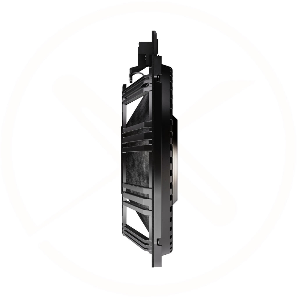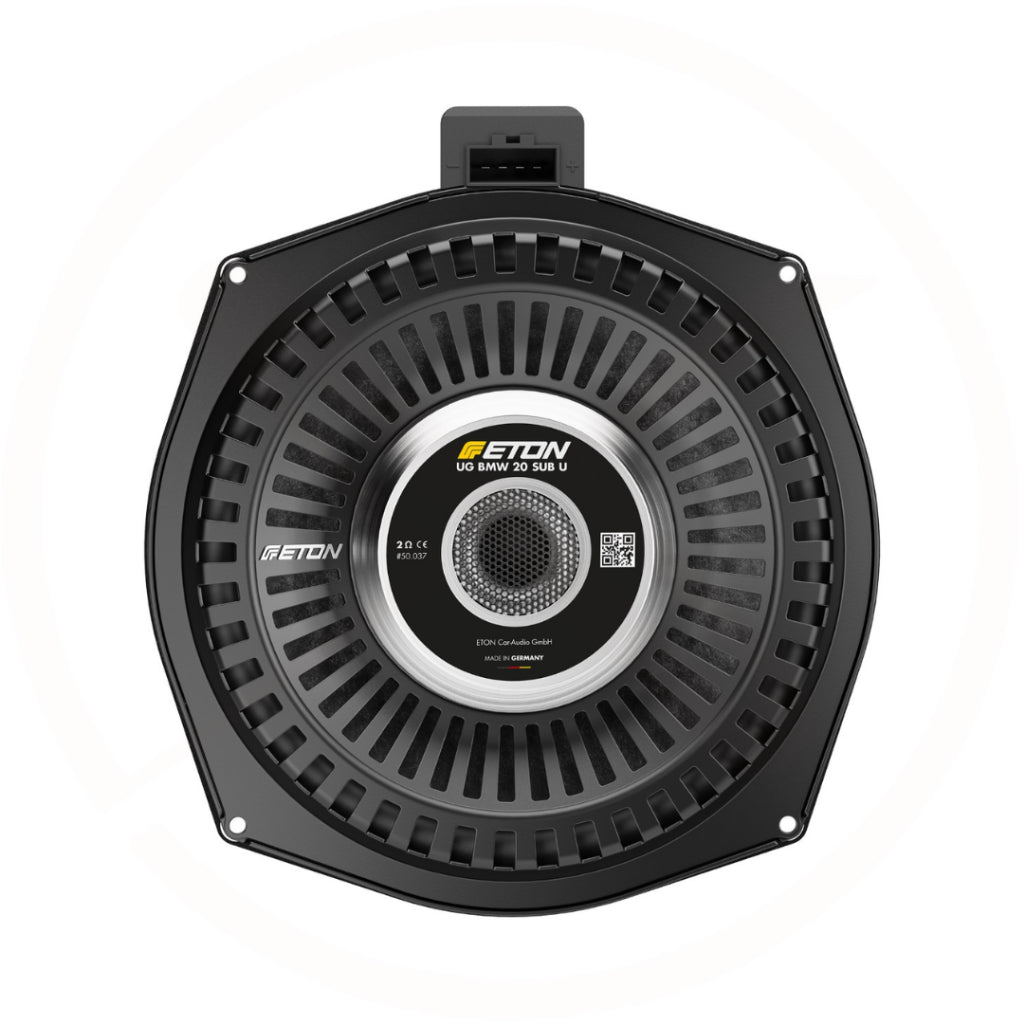 The ultimate 200 mm (8") plug and play BMW sound upgrade in terms of bass: carbon fiber fleece sandwich cone, long excursion surround with perfomanent centering, heavy-duty 63 mm 2 Ω voice coil with a rated power handling of 250 W RMS and a music power handling of 400 W, die-cast aluminum basket in ETON GRAPHIT design with decoupled, vehicle-specific plastic connection terminals and precisely fitting sealing flange with EPDM seal. Heavy-duty and rigid metal grille with optimized aperture. Extremely strong neodymium magnet for explosive dynamics and rock-hard punches out of nowhere. Turned base T-joke with large core bore with protective grille for the best possible cooling and specially coupled aluminum dust cap for additional heat dissipation. Our best BMW subwoofer ever! Made in Germany.